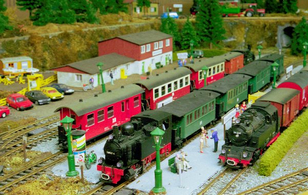 | view of the H0m-model railway (under construction) with reproduction of the station "Alexisbad". In the foreground the line to Stiege, right the line to Harzgerode. Photo: Heiko Zeckai, Dresden Zoom 65,6 KB | view of the station on the LGB-railway model Foto: Heiko Zeckai, Dresden Zoom 79,3 KB |