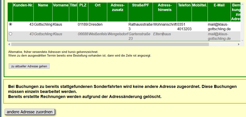 Möchte man in einer Buchung die Adresse des Kunden ändern, dann kann man dass durch Setzen des Auswahlknopfes in der Liste der Adressen (s. Bild 1).